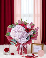 A captivating blend of soft pink hydrangeas and striking red roses, accented with eustoma, eucalyptus, and delicate fillers. Wrapped in rich crimson paper and tied with a blush satin ribbon, this bouquet is a bold expression of love, passion, and elegance — perfect for anniversaries, romantic gestures, or grand celebrations.