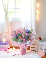 A soft, romantic hand-tied bouquet featuring lavender lisianthus, delicate pink spray roses, and serene purple blooms, artfully nestled among silvery eucalyptus and airy waxflower. Wrapped in layers of blush and ivory paper with a gentle ribbon finish, this arrangement exudes dreamy elegance and calming charm—perfect for birthdays, thank-you gifts, or simply to brighten someone’s day.
