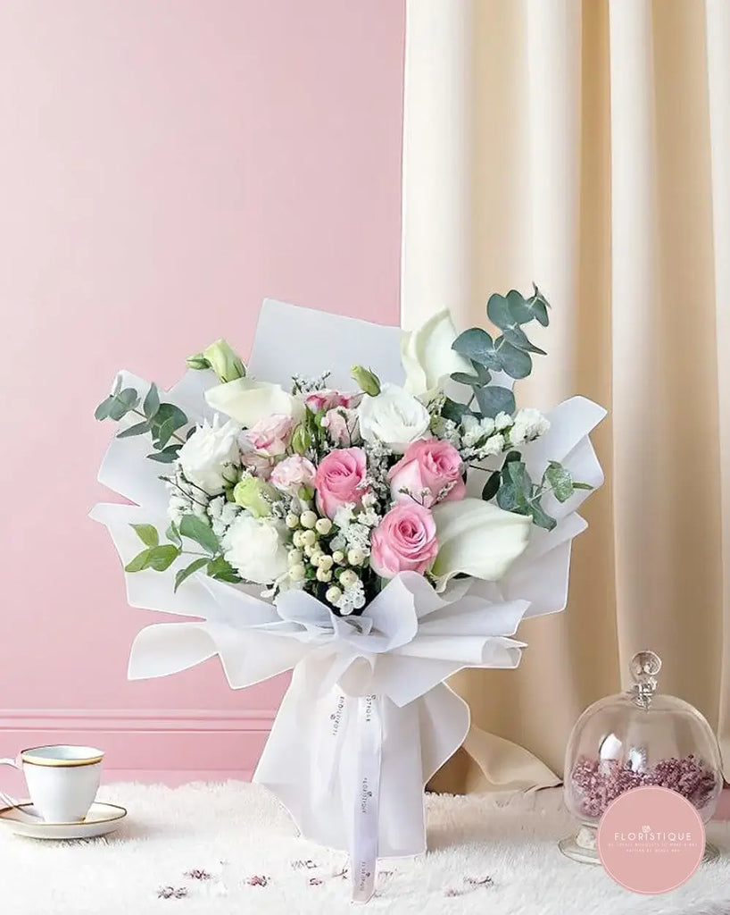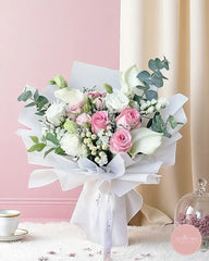 An elegant composition of soft pink roses, white calla lilies, eustoma, and snowberry, accented with delicate fillers and lush eucalyptus. Wrapped in clean white and tied with a satin ribbon, this bouquet is the perfect choice for weddings, anniversaries, or any occasion calling for timeless grace.