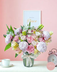 This enchanting vase arrangement showcases the lush beauty of pale pink peonies, soft carnation ruffles, and creamy roses, gently paired with buttery yellow and white blooms. Nestled in a clear glass vase and tied with a satin ribbon, it evokes the freshness of springtime and adds a graceful charm to any space.