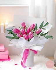 A charming hand-tied bouquet of vibrant pink tulips nestled among verdant eucalyptus and delicate white fillers, elegantly wrapped in crisp white paper with a contrasting pink ribbon. Each stem is carefully selected for its graceful form and long-lasting freshness, creating a soft yet striking display that speaks of joy and affection.