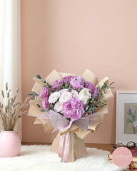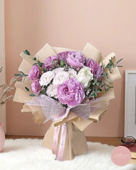 A graceful medley of pink peonies, creamy carnations, and delicate spray roses, accented with lush greenery and wrapped in rustic kraft paper. This bouquet captures the soft romance of spring with a timeless charm, perfect for expressing love, appreciation, or heartfelt wishes.