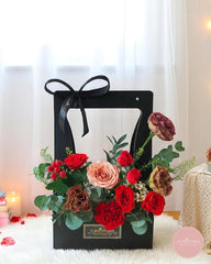 Dramatic and sophisticated, this luxurious black bloom bag features a striking mix of deep red roses, peach-toned garden roses, rich maroon lisianthus, and velvety carnations. Accented with lush eucalyptus and golden buds, the arrangement is finished with a sleek black ribbon for a bold and elegant touch.