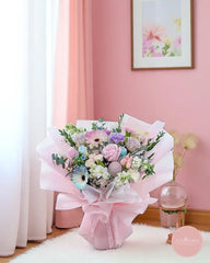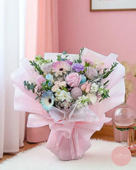 Brimming with soft hues of lavender, blush, baby blue, and cream, this enchanting bouquet features gerberas, roses, and delicate fillers, artfully arranged with a dreamy pink wrap. A touch of shimmer adds a magical finish to this fairy-tale inspired arrangement.