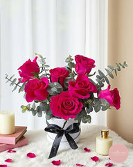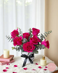 A chic hatbox arrangement featuring striking fuchsia roses paired with fresh eucalyptus leaves, elegantly styled in a round white hatbox and finished with a sleek black ribbon. Radiating sophistication and charm, this arrangement is a timeless expression of love and admiration.