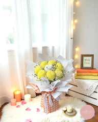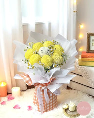 Brighten their day with this sunny bouquet featuring a charming smiley-face bloom made from cheerful yellow and ivory ping pong chrysanthemums. Nestled among dainty chamomile flowers and wrapped in a vibrant gingham sleeve, this bouquet is a burst of happiness in floral form.