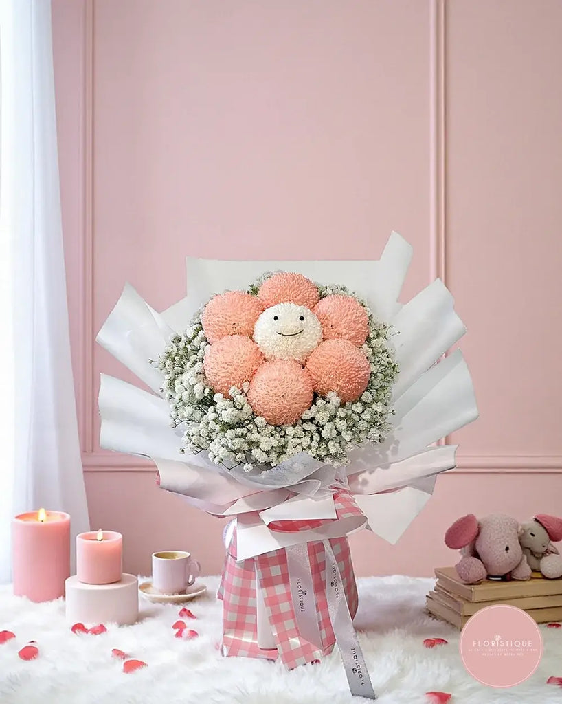 Bursting with charm, this playful arrangement features a delightful smiley-face bloom crafted from fluffy pink and ivory ping pong chrysanthemums, surrounded by a cloud of baby’s breath. Wrapped in sweet gingham pink, it’s a heartwarming gift that brings joy and cheer in the most adorable way.