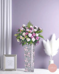 Soft lilac and blush-toned chrysanthemums and asters are gracefully arranged amidst fresh white blooms and lush greens. This gentle condolence stand offers a peaceful farewell and conveys heartfelt sympathy with a touch of serene elegance.