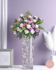 Express your condolences with this refined funeral flower stand. Includes free same-day sympathy flower delivery in Singapore, with islandwide service to wakes, funerals, and memorial locations.