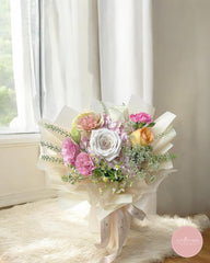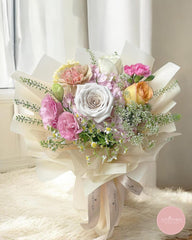 This enchanting bouquet combines soft pastel roses with delicate hydrangea, creating a dreamy and romantic arrangement. Wrapped in elegant cream paper and adorned with a satin ribbon, it’s an ideal gift for celebrating love, friendship, or any special occasion.