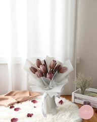This graceful tulip bouquet features soft mauve tulips wrapped in crisp white paper and finished with satin ribbon—perfect for birthdays, anniversaries, or simply to show you care. Its muted tones bring a touch of quiet elegance to any occasion.