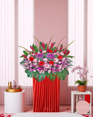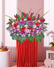 Full of vibrant energy and elegance, this grand opening flower stand features a rich blend of pink gerberas, red roses, purple ornamental cabbages, orchids, and striking ginger blooms. Set in a bold red satin base and framed with tropical foliage, this stunning display represents strength, abundance, and celebration.