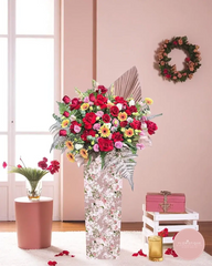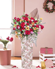 Celebrate new beginnings with this vibrant and joyful arrangement featuring radiant red roses, sunny gerberas, and delicate pink blooms. Enhanced with soft foliage and a stylish fan palm, this grand opening stand exudes charm, energy, and prosperity.