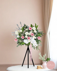 This elegant arrangement blends soft blush pink gerberas, pristine white roses, and cascading orchids with lush greenery, radiating peace and grace. Perfectly balanced, it brings a refined touch to grand openings or heartfelt celebrations.