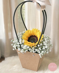This sunny arrangement features a vibrant sunflower surrounded by delicate baby's breath, creating a bright and joyful display. Presented in a stylish tan handbag with a soft satin ribbon, it's the perfect gift to bring happiness and warmth to any occasion.