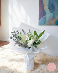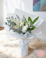 Introducing our Elegant White Bouquet, a harmonious blend of pristine white roses, calla lilies, and lush greenery. Artfully arranged and wrapped in delicate white paper, this bouquet exudes timeless elegance and sophistication, making it perfect for weddings, anniversaries, or any special occasion. Let this exquisite arrangement bring a touch of grace to your loved one's day.