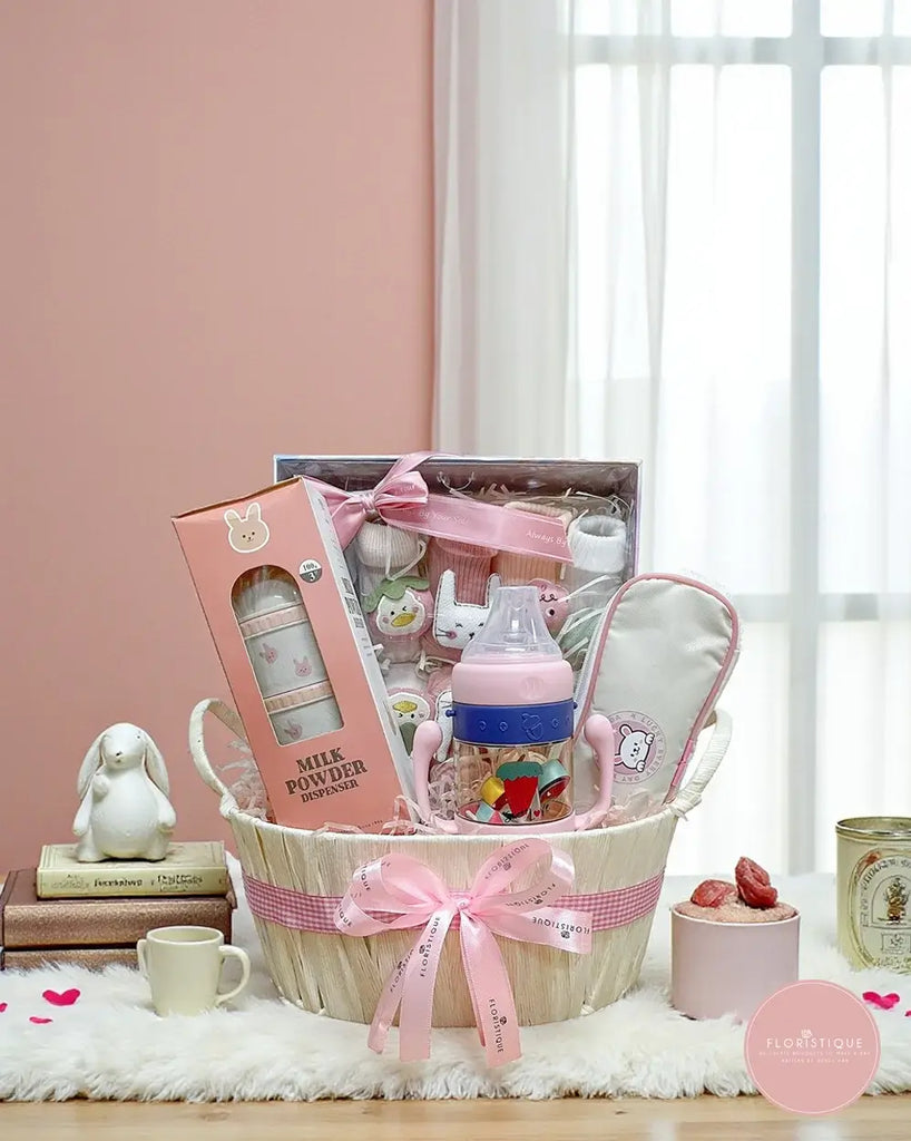 A thoughtful hamper designed to celebrate the arrival of a baby girl. This set includes a pink baby clothing set, a milk powder dispenser, a feeding bottle, mittens, and an insulated bottle pouch — all neatly arranged in a woven basket and finished with a pink ribbon. Beautifully practical, it’s the perfect gift for new parents.