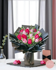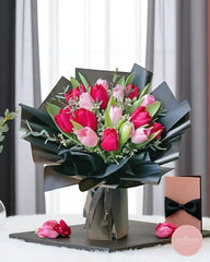 A bold and romantic pairing of red and pink tulips, this bouquet is artfully arranged with fresh greens and dainty fillers, then wrapped in striking matte black for a dramatic finish. A perfect gift to express deep admiration, passion, or heartfelt affection on anniversaries, birthdays, or just because.