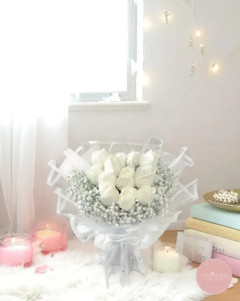 Order your Snowy Whisper Bouquet today for premium white rose bouquet delivery Singapore-wide, baby’s breath bouquet delivery Singapore, and same-day flower delivery islandwide!