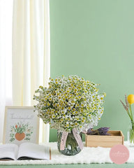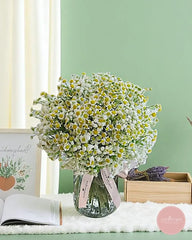 This charming vase arrangement features a joyful blend of chamomile and baby’s breath, carefully styled in a clear glass vase to radiate warmth and simplicity. The soft white and yellow hues bring a calming presence—perfect for brightening up any space or sending gentle well wishes.