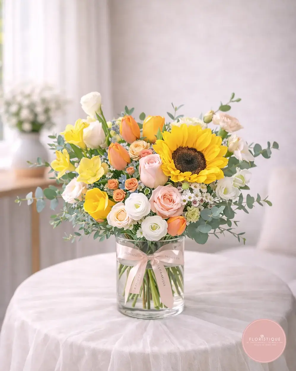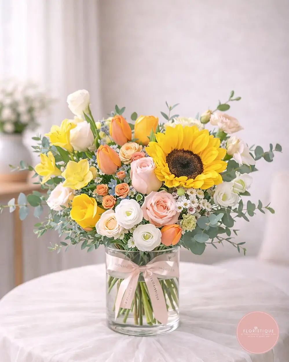 Radiating warmth and joy, this vibrant vase arrangement showcases a bold sunflower surrounded by cheerful tulips, ranunculus, roses, freesia, and daisies. The mix of yellow, orange, and soft peach blooms creates a lively yet balanced display, complemented by fresh eucalyptus greens.