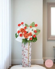 Bright orange gerberas and hydrangeas offer a gentle touch of warmth amidst the calm of pristine white chrysanthemums and tropical foliage. Arranged in a tall, floral-patterned stand, this arrangement expresses a heartfelt farewell with both dignity and hope.