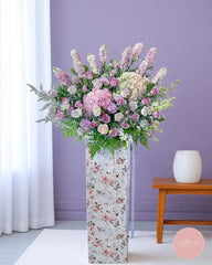 A graceful arrangement in soft purples and blush pinks, this condolence stand features hydrangeas, roses, and delicate snapdragons, framed with fern and silver foliage. The gentle hues evoke peace, comfort, and enduring memories during times of sorrow.
