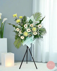 Convey heartfelt condolences with this soothing arrangement of soft white gerberas, spider chrysanthemums, and delicate greenery. Artfully wrapped in calming mint-toned sheets and complemented with graceful palm fronds, this condolence stand offers a peaceful presence during times of mourning.