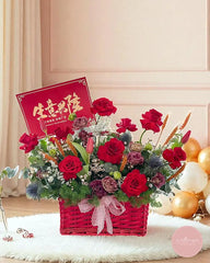 Radiating bold elegance and prosperity, this grand opening floral basket features a striking ensemble of red roses, mauve eustomas and textured botanicals — including thistle, wheat stalks, and fresh greenery. Arranged in a vibrant red woven basket and finished with a lace bow, it’s a powerful symbol of success, passion, and new beginnings.