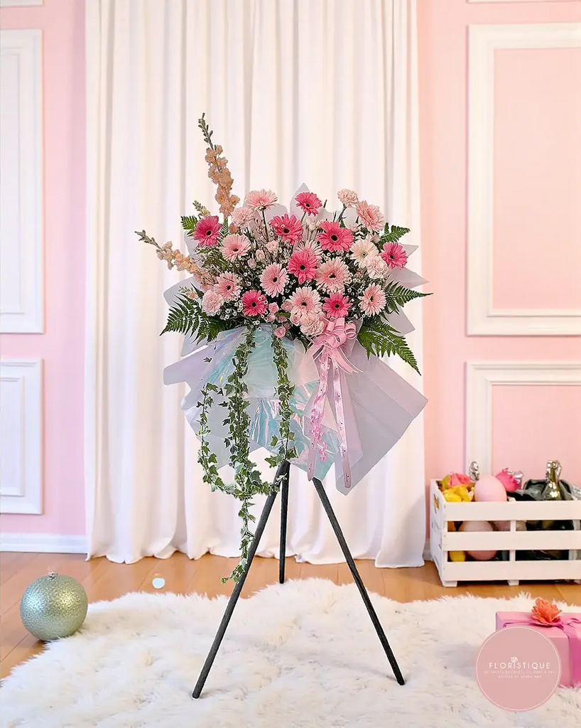 A graceful arrangement of soft pink gerberas, delicate carnations, and lush greenery, elegantly wrapped with pastel tones and trailing vines. Radiating beauty and joy, this floral stand symbolises new beginnings, heartfelt congratulations, and enduring success — the perfect way to celebrate a shop opening or business milestone.