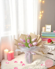 Fresh, graceful, and full of charm, this bouquet features nine delicate pink tulips—each symbolising care and new beginnings. Wrapped in natural kraft paper with white accents and finished with a soft pink ribbon, it’s a sweet and meaningful gesture for any occasion.