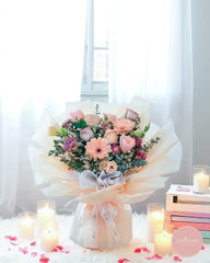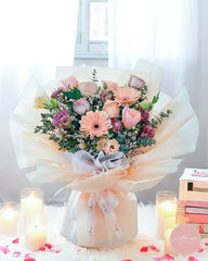 Celebrate love, warmth, and elegance with the Ethereal Romance Bouquet — a stunning arrangement of pastel pink roses, cheerful peach gerberas, soft spray carnations, and fresh seasonal blooms, all wrapped in luxurious cream-toned paper. Designed by expert florists at Floristique, this bouquet captures both charm and sophistication in one breathtaking gift.