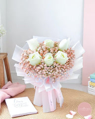 Soft ivory roses bloom gently amidst a bed of delicate pink fillers, creating a bouquet that speaks of grace, innocence, and quiet affection. Perfect for expressing congratulations, admiration, or well wishes.