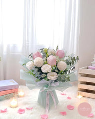 Evoke tender sentiments with our "Pastel Serenity" bouquet. Three light pink roses, paired with eustoma and chrysanthemum, embody grace and appreciation. Delicately presented in a pastel green wrapper, this arrangement exudes tranquility and elegance.