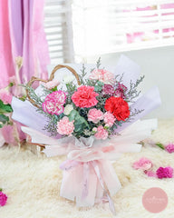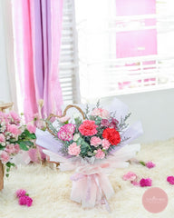 A stunning creation from our signature florist collection, this bouquet features a harmonious blend of pink and red carnations, complemented by soft fillers and eucalyptus greens. Wrapped in elegant blush and lilac tones, it’s thoughtfully designed to express love, gratitude, or celebration.
