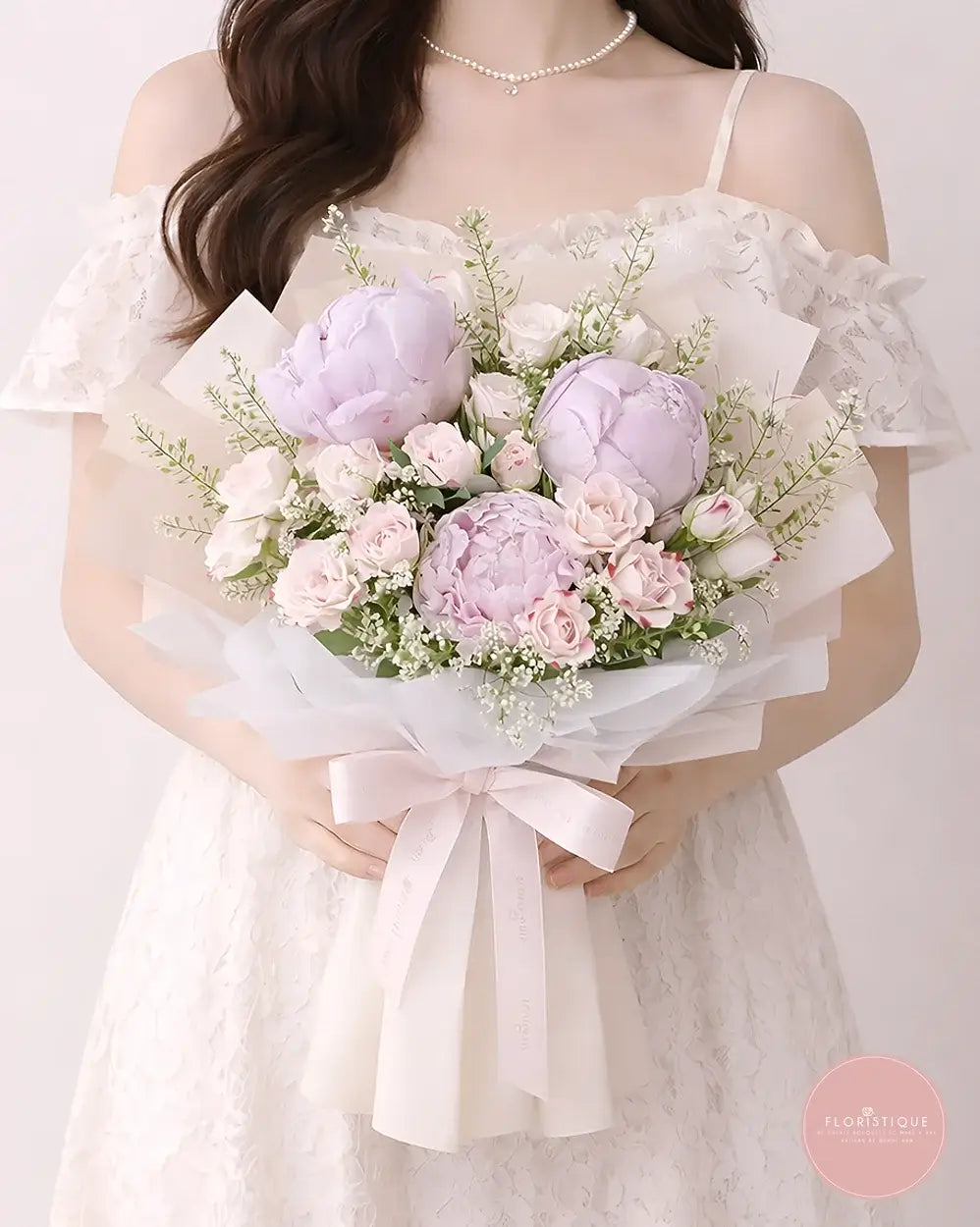 A graceful ensemble of lush lilac peonies, soft blush spray roses, and dainty white fillers, this bouquet is the epitome of feminine elegance. Wrapped in muted pink tones and finished with a sheer ribbon, it’s a tender expression of love, gratitude, or celebration.
