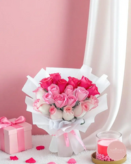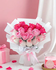 A stunning trio of hot pink, soft blush, and creamy white roses arranged in perfect harmony and wrapped in sleek white with matching satin ribbons. Bold yet graceful, this bouquet is the perfect romantic gesture for anniversaries, birthdays, or simply to say “I adore you.”