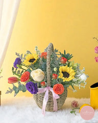 Bursting with the joyous hues of sunflowers, orange ranunculus, purple eustoma, and delicate tulips, this radiant basket is a celebration of colour and life. Creamy white roses and sprigs of lush greenery complete the look, all thoughtfully nestled in a charming woven basket with a soft satin ribbon bow. It’s the perfect gesture to brighten someone’s day or bring cheer to any room.