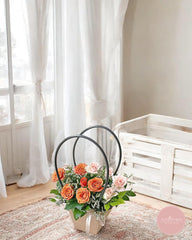 Presenting an exquisite floral arrangement, this piece features delicate pink roses and lush baby's breath, nestled in a chic kraft paper box with an elegant satin ribbon. Two charming, fluffy bunny figures add a whimsical touch, perfect for a luxurious gift.