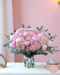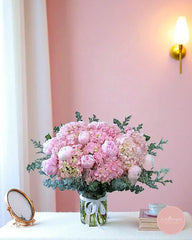 A luxurious blend of lush pink peonies and voluminous hydrangeas, this arrangement radiates elegance and romance. Nestled in soft eucalyptus greens, each bloom exudes gentle charm and femininity, making it a perfect centerpiece for heartfelt occasions or thoughtful gifting.
