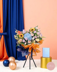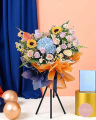 Celebrate new beginnings with this radiant arrangement featuring cheerful sunflowers, soft blush roses, and a show-stopping hydrangea centerpiece in powder blue. Accented with vibrant orange anthuriums and golden yellow sprigs, this floral stand is wrapped in bold orange and midnight-toned paper for a striking contrast.