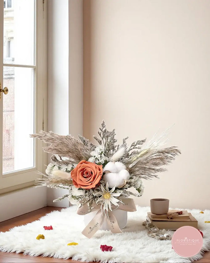 This charming preserved arrangement features a striking orange rose paired with cotton, dried foliage, and dainty fillers, creating a rustic yet elegant display. Styled in a chic vase with a ribbon finish, it’s a thoughtful piece perfect for home décor, gifting, or bringing warmth to any celebration.