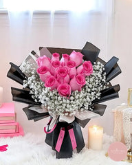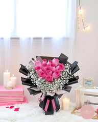 A striking hand-tied arrangement featuring vibrant fuchsia roses nestled in a cloud of delicate baby’s breath, all wrapped in luxe black and soft ivory paper. The dramatic contrast highlights each velvety bloom’s bold hue, creating a modern statement piece that’s perfect for anniversaries, congratulations, or making a memorable impression.