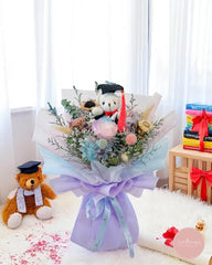 Celebrate a proud milestone with our Graduation Bear Preserved Flower Bouquet — a charming arrangement of pastel preserved blooms including roses, hydrangeas, and billy balls, accented with fluffy textures and dried foliage. Nestled at the heart is an adorable teddy bear in a graduation cap, symbolizing achievement and joy. Wrapped in lavender-toned paper and finished with satin ribbons, this bouquet is a keepsake to remember.