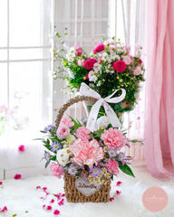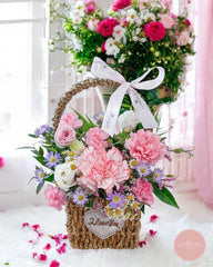 Brimming with soft pink carnations, lisianthus, white roses, and cheerful purple and yellow daisies, this basket arrangement captures a sweet expression of love and affection. Handcrafted in a woven basket adorned with an “I Love You” patch and finished with a Floristique ribbon, it’s a thoughtful choice for birthdays, Mother’s Day, or romantic gestures.