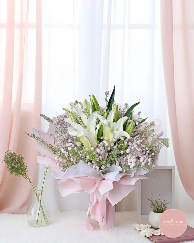 Send this white lily bouquet from a trusted online florist in Singapore. Enjoy same day flower delivery Singapore-wide and let your thoughtful gesture arrive fresh, elegant, and heartfelt.