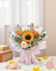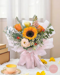 Bursting with cheerful hues, this joyful bouquet features a bright sunflower, warm orange roses, soft lisianthus, and playful chamomile blooms, all wrapped in pastel pink and tied with a delicate ribbon. Lush greenery adds texture and balance, making it a radiant gift for birthdays, congratulations, or simply to uplift someone's day.