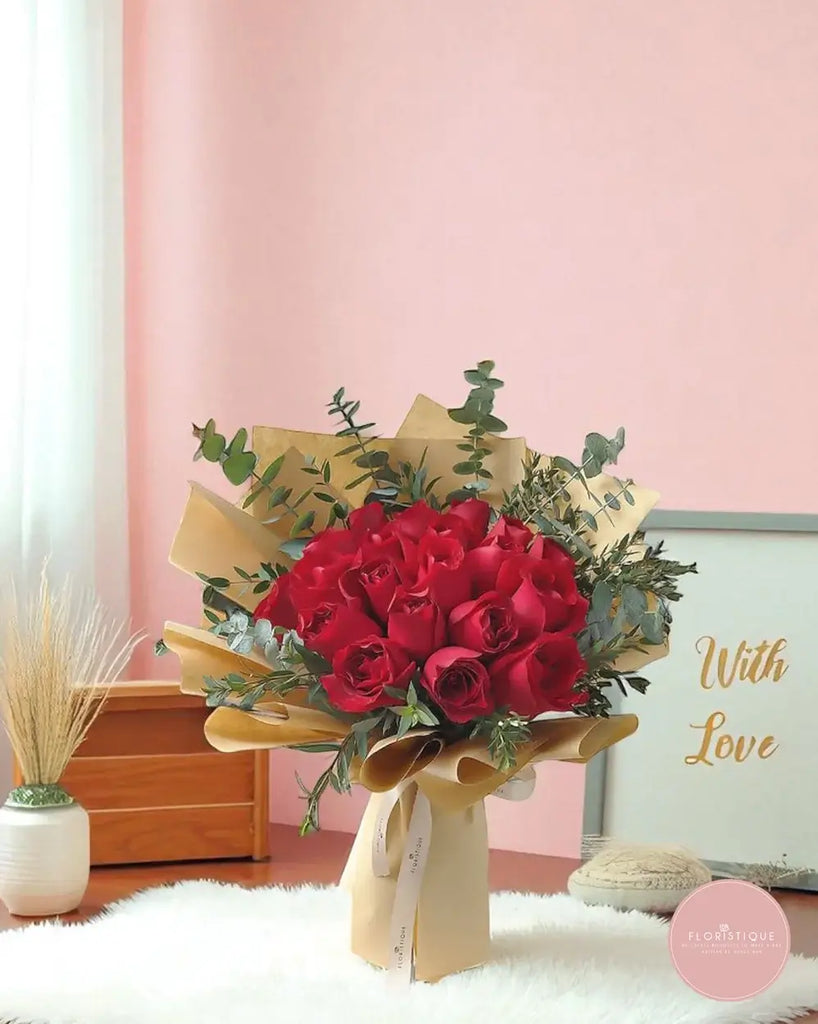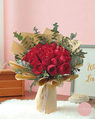 Make a bold statement with this exquisite hand bouquet of rich red roses, elegantly wrapped in warm-toned kraft paper and accented with fresh eucalyptus leaves. Each rose is carefully selected for its vibrant hue and velvety texture, making this arrangement a timeless symbol of love and passion.