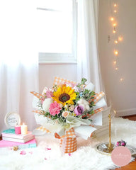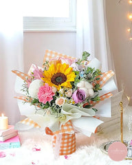 This cheerful bouquet bursts with joy, featuring a bright sunflower at its heart surrounded by charming pink carnations, lilac roses, delicate daisies, cotton blooms, and pastel-toned fillers. Wrapped in playful orange gingham, it radiates warmth and whimsy.