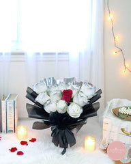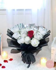 Elegant and symbolic, this bouquet features a captivating arrangement of white roses with a single bold red rose at its heart—representing the one who stands out above the rest. Wrapped in sleek black and silver layers with a satin ribbon, it's a powerful expression of admiration and love.